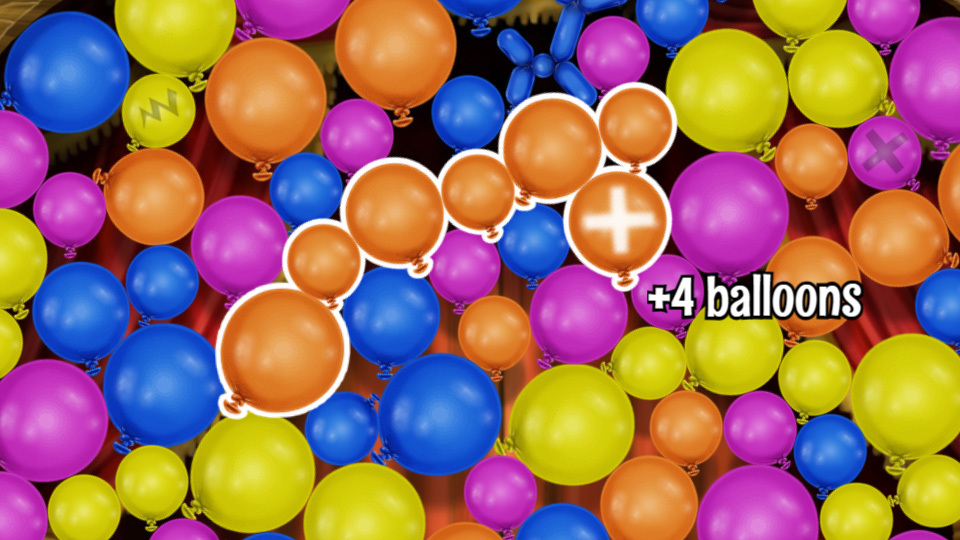 Each round ends with a special sequence where you get the opportunity to burst any excess balloons. Each excess balloon you blow up is carried over to the next round, so it's very important to blow up as many as possible. If you burst them all, you complete the round perfectly and get a token bonus and a power-up.