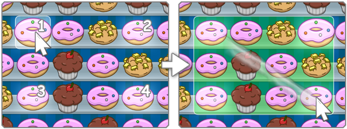 You get points according to how many delicious cakes you remove. For example, if there are 12 cakes in your square, you get 12 points. However, the number of points you get is multiplied by your multiplier. Your multiplier starts at x1, but when you remove squares containing a multiplier symbol, your multiplier increases. If you remove a small square of 4 cakes with a multiplier symbol, your multiplier will increase by 4, for example to x5. If you then remove 12 cakes again, they will now give 60 points (5 x 12).