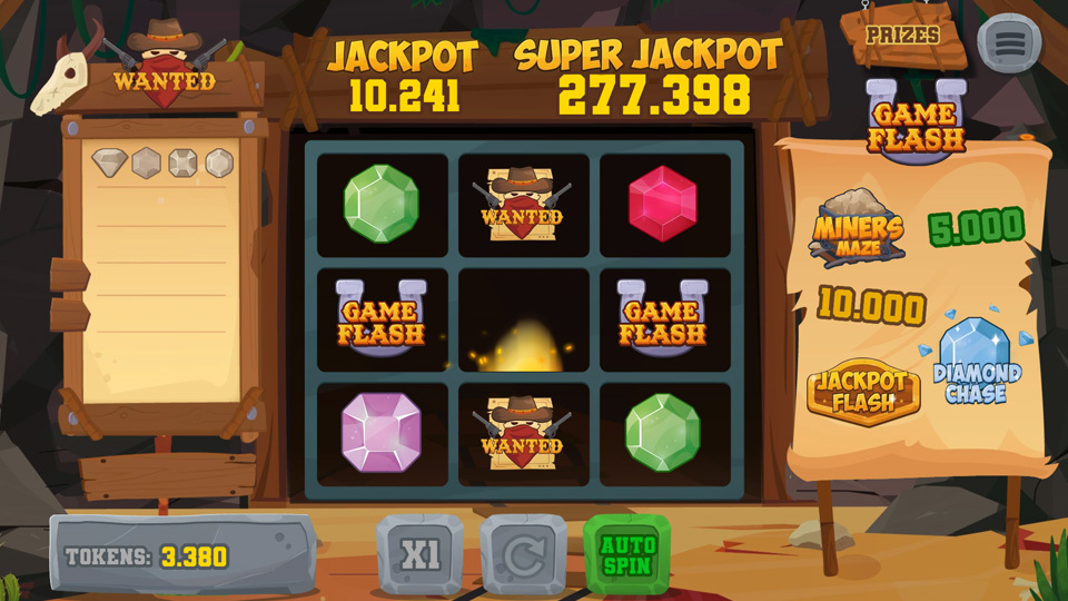 By getting Game Flash you can be lucky to win tokens, Diamond Chase, Miners Maze or Jackpot Flash. You get a Game Flash by getting three Game Flash symbols in a row.