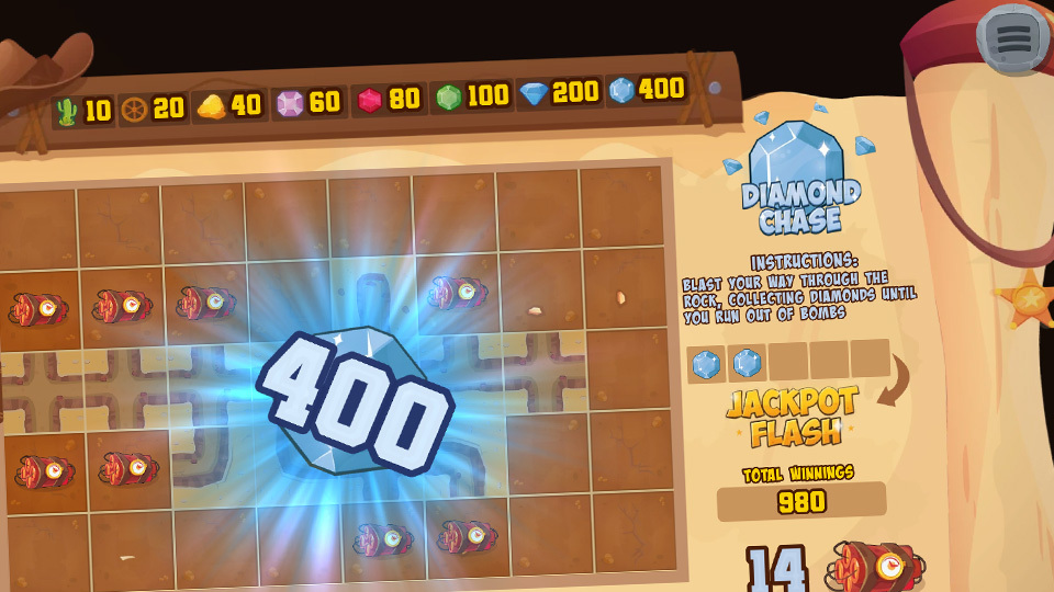 In Diamond Chase you enter the mine to look for diamonds by using dynamite to clear the way. Click on one of the fields with a dynamite to blow away the stones and if you're lucky you might find a diamond under them. There are a total of five diamonds in the mine and if you find them all, you win a Jackpot Flash. You have a total of 25 dynamite and when you run out of them, the game ends. You can play Diamond Chase by getting three Diamond Chase symbols in a row or win it in Game Flash.