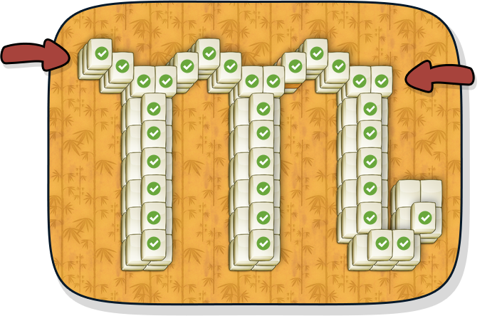 RulesMahjong is easy to learn but requires great care to master. A Mahjong level consists of 144 tiles. A tile can be paired with an identical tile, if it is free. A tile is only free, if the right and/or left side of the tile is free, and if there is no tile on top of it. See the following examples: