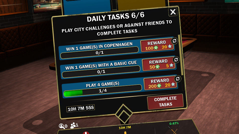 You have the opportunity to complete daily tasks to earn chips and silver stars. The daily tasks vary in difficulty and thus also in prize size. You have three tasks from the start and have the option to have 6 tasks at once. You can buy new tasks with gold balls if you want to solve more.